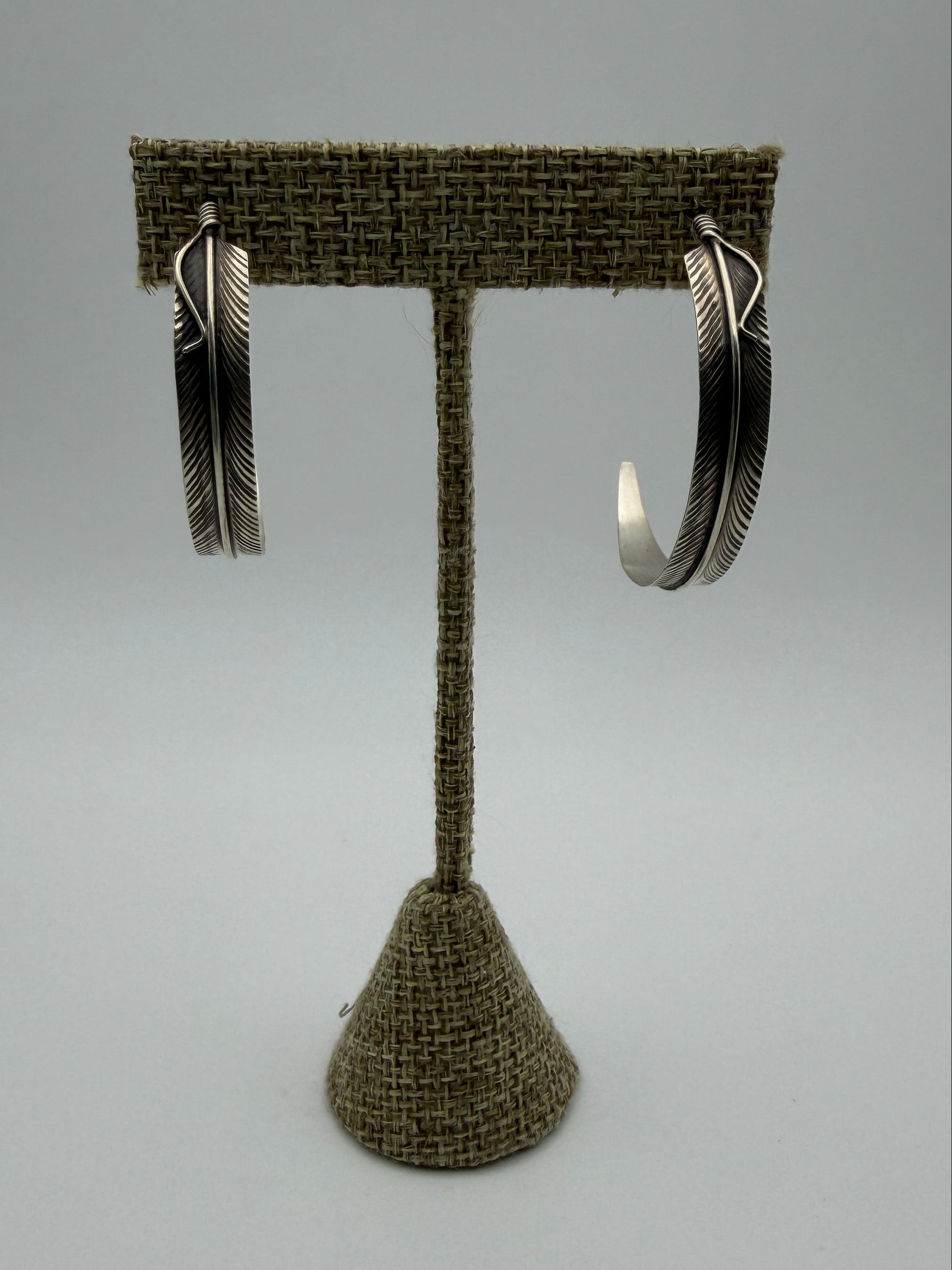 Handmade by Navajo silversmith Chris Charley (CC), these sterling silver half-hoop earrings feature deep, dimensional feather carving and traditional Navajo craftsmanship. Chris Charley’s featherwork is highly recognizable — clean, detailed, and beautifully balanced — making these hoops a wearable piece of art.