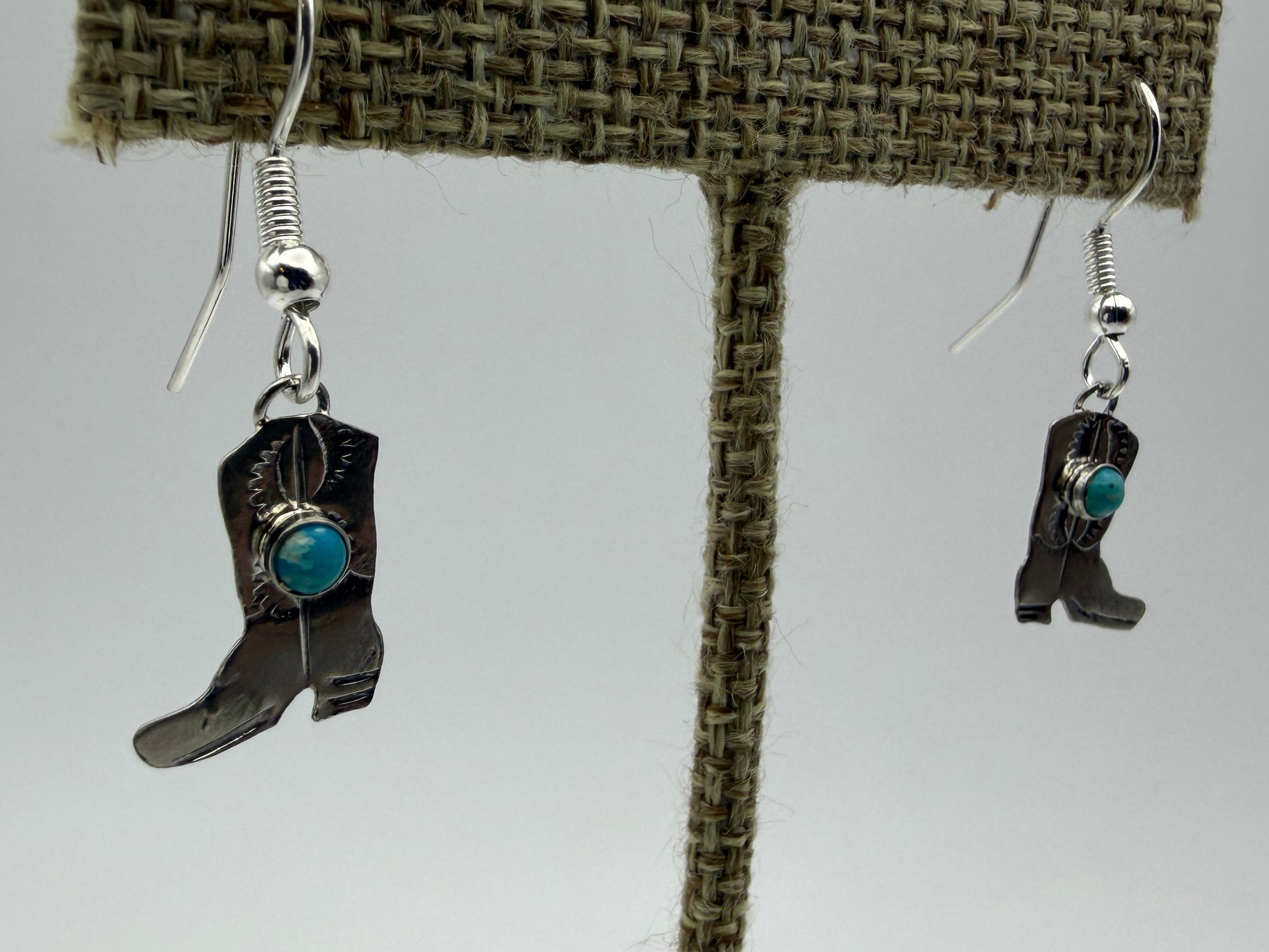 Handmade by Navajo artist Lucille Platero in Gallup, NM, these adorable sterling silver boot earrings feature hand-stamped details and genuine turquoise stones. The boots themselves are solid sterling silver, with comfortable silver-plated ear wires — a common Gallup style that keeps them lightweight and easy to wear.